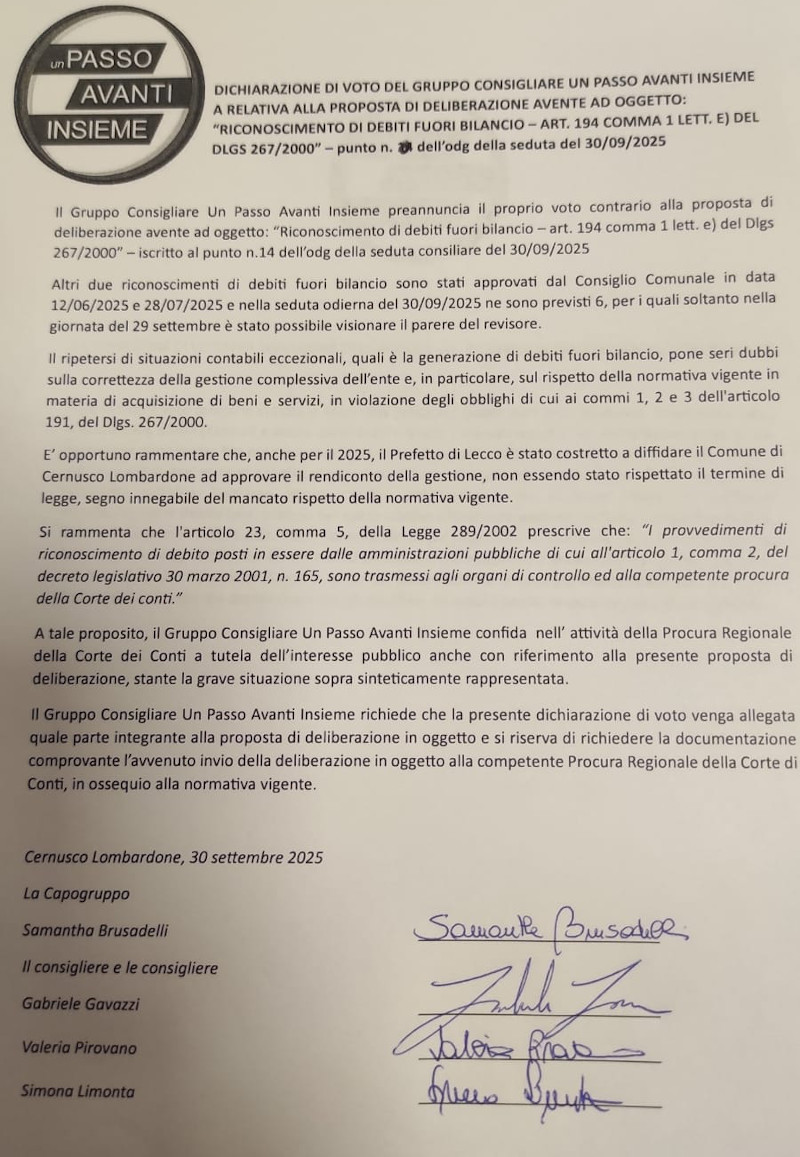 Sei, come dicevamo, i debiti fuori bilancio portati in discussione, riferiti ad annualità differenti (due sono datati durante il mandato della precedente amministrazione comunale) con la minoranza guidata da Samantha Brusadelli che ha sempre votato contro, contestando come “il ripetersi di situazioni contabili eccezionali, quali è la generazione di debiti fuori bilancio, pone seri dubbi sulla correttezza della gestione complessiva dell’ente e, in particolare, sul rispetto della normativa vigente in materia di acquisizione di beni e servizi” (QUI L’INTERVENTO INTEGRALE).