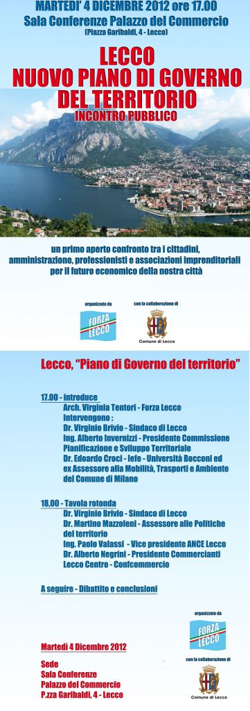 LECCO – L’Associazione Forza Lecco ha organizzato, con la collaborazione del Comune di Lecco, un incontro pubblico sul nuovo Piano di Governo del Territorio, a breve in fase di adozione dall’amministrazione della Città, che si terrà il prossimo martedì 4 dicembre, dalle o17, presso la Sala Conferenze, Palazzo del Commercio (Piazza Garibaldi 4 Lecco).