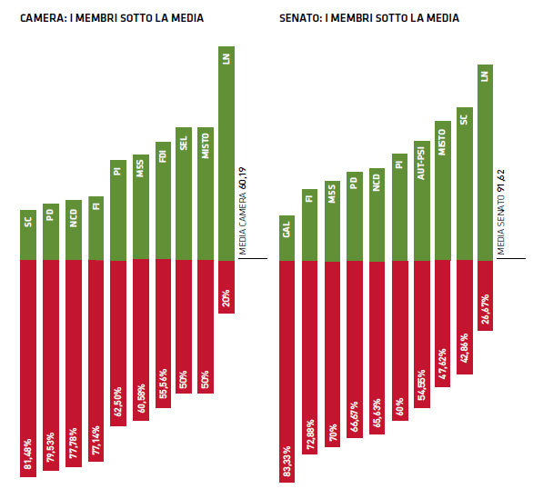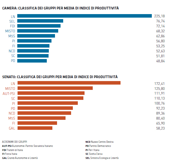 A spiccare per produttività sono le opposizioni, in primis la Lega Nord sia alla Camera che al Senato, secondI alla Camera ci sono i deputati di Sinistra Ecologia e Libertà seguiti da Fratelli d’Italia, mentre a Palazzo Madama completano il podio il Gruppo Misto e le Autonomie con il Partito Socialista Italiano.
