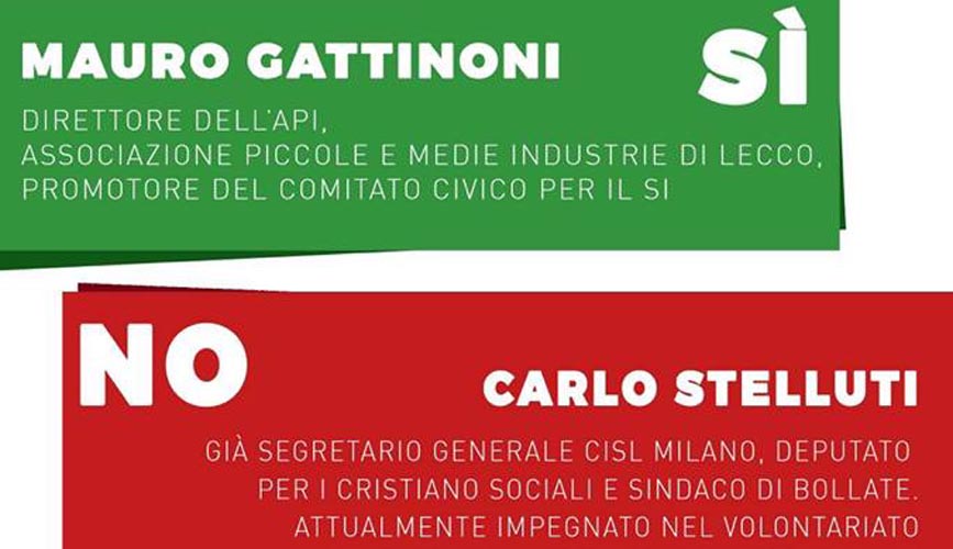 Al tavolo dei relatori ci saranno Mauro Gattinoni, direttore di Api Lecco, e promotore del comitato civico per il ‘Sì’ , e Carlo Stelluti, già segretario generale della Cisl di Milano, deputato per i crisiano sciali e sindaco di Bollate, attualmente impegnato nel volontariato.
