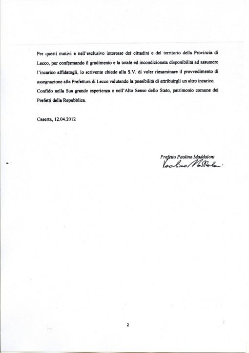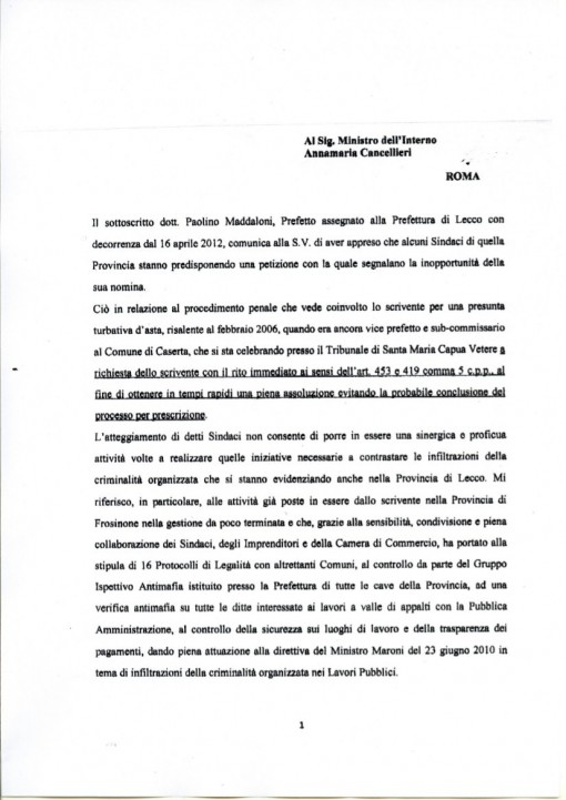 Dal Viminale infatti comunicano che : “Il ministro dell’Interno, Annamaria Cancellieri, ha espresso il proprio apprezzamento per la sensibilità e il rispetto istituzionale dimostrati dal prefetto Paolino Maddaloni che, a seguito di alcune polemiche che hanno accompagnato la sua nomina alla guida della Prefettura di Lecco, con una lettera inviata oggi al Ministro, ha chiesto di essere assegnato ad altro ufficio. Il ministro Cancellieri, fiduciosa in una rapida conclusione dell’iter processuale che vede coinvolto il prefetto Maddaloni per fatti risalenti al 2006, ha deciso di destinarlo ad altro incarico.”
