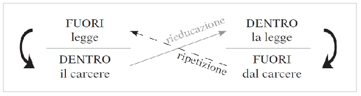 Questa prospettiva prende atto della spinta a ripetere che porta un detenuto a tornare incessantemente in carcere e mette al centro del discorso il soggetto specifico. La valutazione d’inefficacia, che spesso si associa al regime detentivo quale strumento di rieducazione, va quindi in parte relativizzata. Stare nel legame sociale implica accettare una serie di norme che regolano lo scambio e la convivenza tra individui; ciascuno deve trovare un modo vivibile per starci dentro in questo legame con l’altro; legge e legame si annodano e infrangere la legge significa minare alla radice la possibilità dello stare in un certo tipo di vincolo con l’altro.