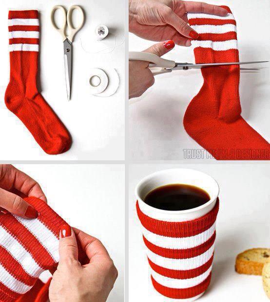 Basta uova di legno, ditale, ago e filo…le calze bucate rivivono una seconda vita intorno a bicchieri porta candela, vasi e tazze.