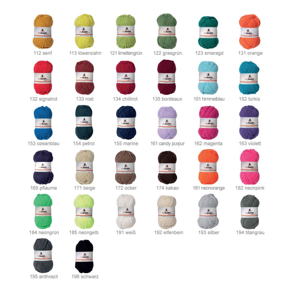 Presso oltre 1.000 mercerie e negozi di hobbistica distribuiti su tutto il territorio italiano, è possibile acquistare tutto il necessario per realizzare, secondo i propri gusti, un myboshi originale. Fare un myboshi è semplice, bastano i punti base come quello a catenella e la mezza maglia alta e i seguenti ingredienti: tre gomitoli di lana myboshi, un uncinetto n.6, le istruzioni myboshi (in due versioni: mini-libro 3 creazioni/libro 15 creazioni). La disponibilità di 36 varianti di colore dei gomitoli (30% lana Merino superwash e 70% acrilico) offre oltre ai gialli, aranci, rossi, blu, bianchi e nero, anche una moderna gamma di colori neon.