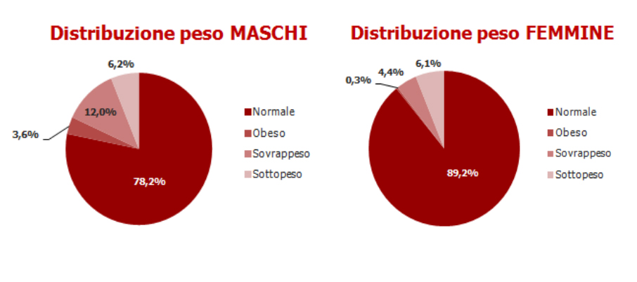 Complessivamente il peso medio degli alunni si aggira intorno a 43,1 kg ed un’altezza media di 155 cm corrispondenti ad un Indice di Massa Corporea (IMC) di 17,9 (equivalente alla normalità). Dei 569 studenti che hanno specificato i dati antropometrici nel questionario, solo 477 (pari all’84%) hanno un peso nella norma mentre il 6% risulta sottopeso, l’8% sovrappeso e il 2% è obeso.