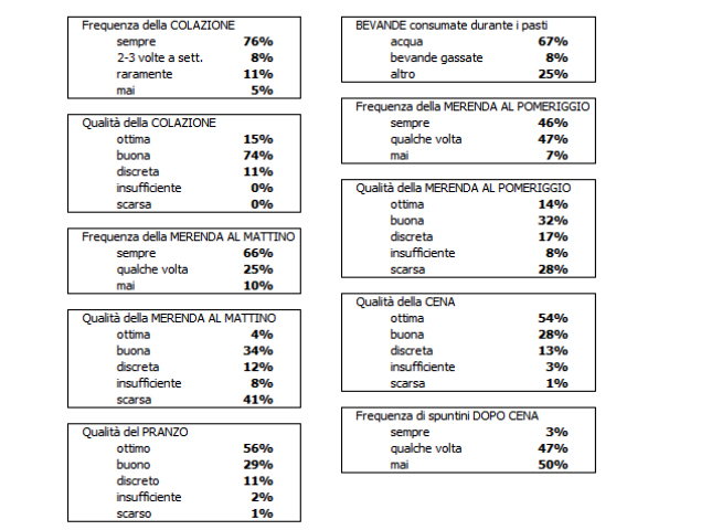 Secondo le risposte degli studenti al questionario proposto risulta che solo 3 ragazzi su 4 fanno colazione tutti i giorni, come consigliato, mentre il 16% fa colazione raramente o addirittura mai. La percentuale scende al 66% tra quanti fanno merenda durante l’intervallo scolastico ma quasi la metà di loro (49%) consuma uno spuntino nutrizionalmente insufficiente o scarso. Si tratta per la maggior parte di merendine confezionate, patatine in sacchetto, barrette di cioccolato spesso accompagnate da tè freddo o bevande gassate zuccherate. Comode da portare nello zaino ma eccessivamente caloriche. Solo il 4% dei ragazzi consuma frutta come snack al mattino.