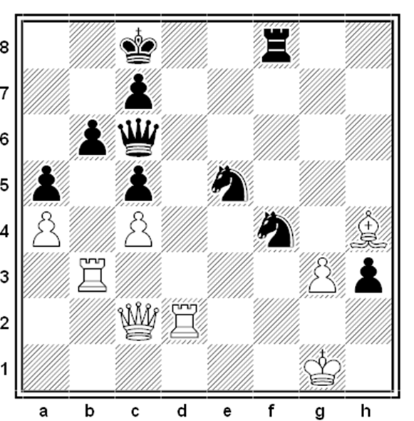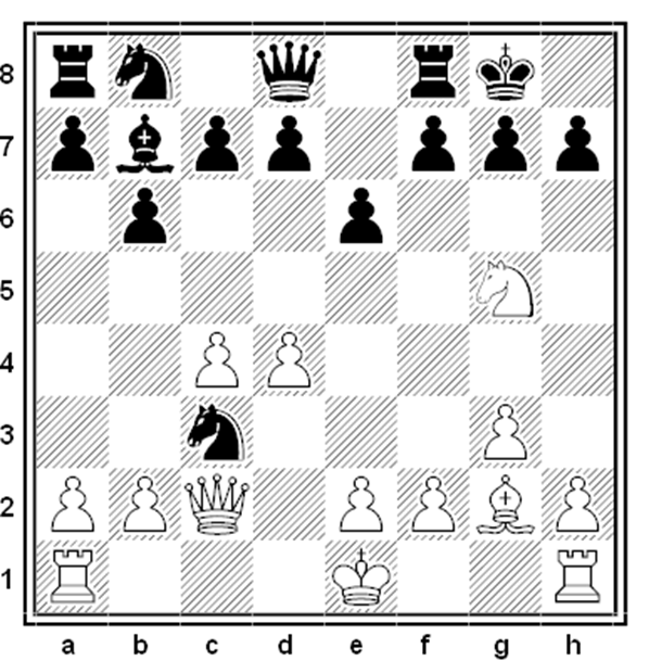 minacciando contemporaneamente lo scacco matto in h7 e l’alfiere in b7, il nero deve parare la minaccia di matto ma sicuramente perderà l’alfiere e la torre, la partita continuò con 10…Ce4 11. Axe4 Axe4 12. Dxe4 Dxg5 13. Dxa8 Da5+ 14. Rf1 Da6 15. De4 Dxc4 16 b3 Db4 17. Dd3 c5 18. dxc5 Dxc5 19. Rg2 f5 20. Tac1 Da3 21. Tc2 d5 22. Tc7 Dd6 23. Thc1 Cd7 24. T1c6 De7 25. Txa7 f4 26. Tcc7 fxg3 27. hxg3 Df7 28. f3 Td8 29. Txd7 abbandona 1-0 si deve dare la Donna sia catturando con la torre, a cui segue lo scacco dell’altra torre in a8, sia catturando con la stessa Donna.