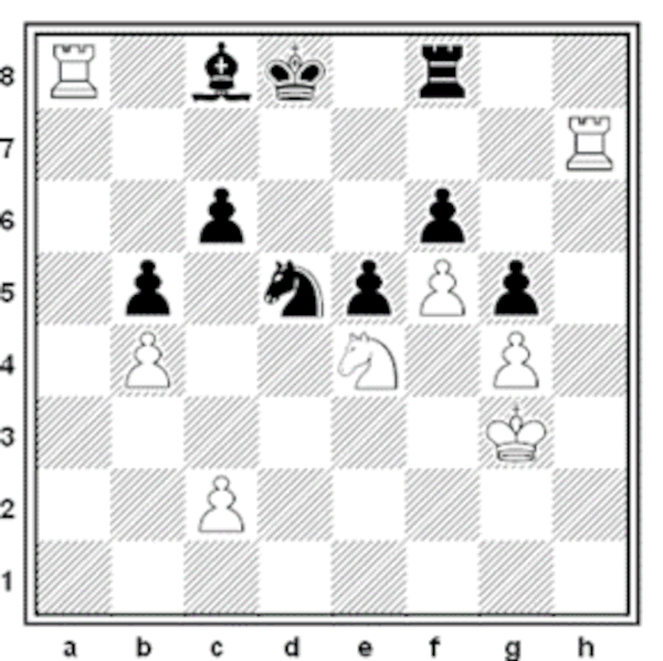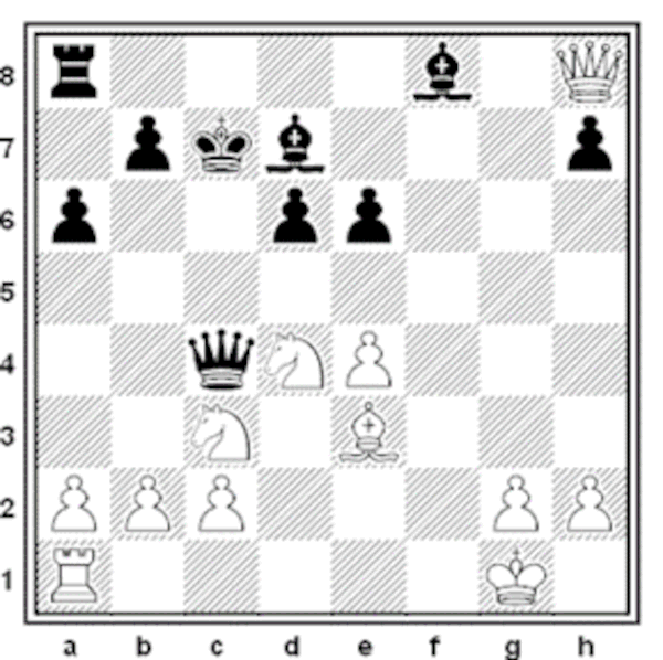 1. e4 c5 2. Cf3 Cc6 3. d4 cxd4 4. Cxd4 Cf6 5. Cc3 d6 6. Ae2 e6 7. O.O a6 8. Ae3 Dc7 9. f4 Ca5 10. f5 Cc4 11. Axc4 Dxc4 12. fxe6 fxe6 13. Txf6 gxf6 14. Dh5+ Rd8 15. Df7 Ad7 16. Df6+ Rc7 17. Dxh8