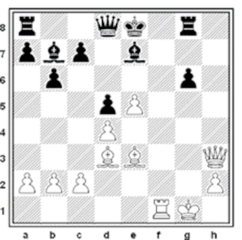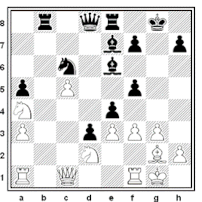 1. d4 d5 2. c4 e6 3. Cc3 Cf6 4. Ag5 Ae7 5. Cf3 O-O 6. c5? bisognava continuare con e3 b6 7. b4 bxc5 8. dxc5? Grave errore ora il pedone è libero a5! 9. a3 d4! 10. Axf6 gxf6 11. Ca4? Un altro errore che costerà caro al Bianco e5! 12. b5 Ae6 13. g3 c6 14. bxc6 Cxc6 15. Ag2 Tb8 16. Dc1 d3 17. e3 e4! 18. Cd2 f5! 19. O-O Te8 20. f3 20…Cd4!
