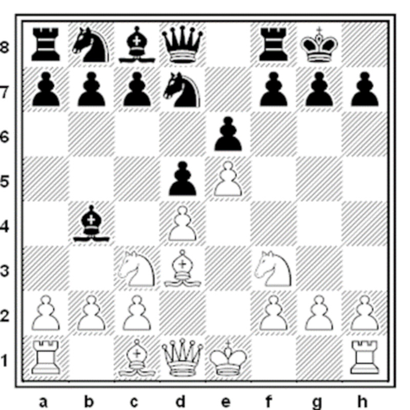 Questo è un semplice caso in cui funziona il sacrificio del “dono greco”. Il Bianco può giocare 7.Axh7 +! Rxh7 8.Cg5 + quindi se: 8 … Rh8 9.Dh5 + Rg8 10.Dh7 # se: 8 … Rg8 9.Dh5 minacciando 10.Dh7 #, a cui sono possibili le uniche risposte 9 … Dxg5 10.Axg5 per evitare le terribili conseguenze il Nero dovrebbe rinunciare alla Regina catturando il Cavallo ma si sa che senza Regina è duro combattere e se: 9 … Te8 10.Dxf7 + Rh8 11.Dh5 + Rg8 12.Dh7 + Rf8 13.Dh8 + Re7 14.Dxg7 # e su 8 … Rh6 9.Cxf7 + vincerebbe la Regina e a 8 … Rg6 9.h4 e non esiste un modo soddisfacente per affrontare la minaccia di 10.h5 + Rh6 (10 … Rf5 11.Df3 #) 11.Cxf7 +, vincendo la Regina.
