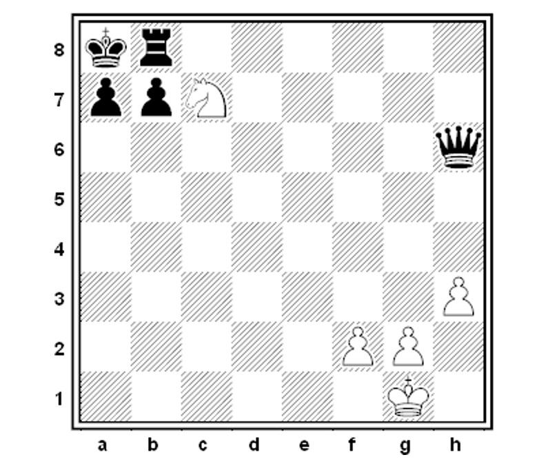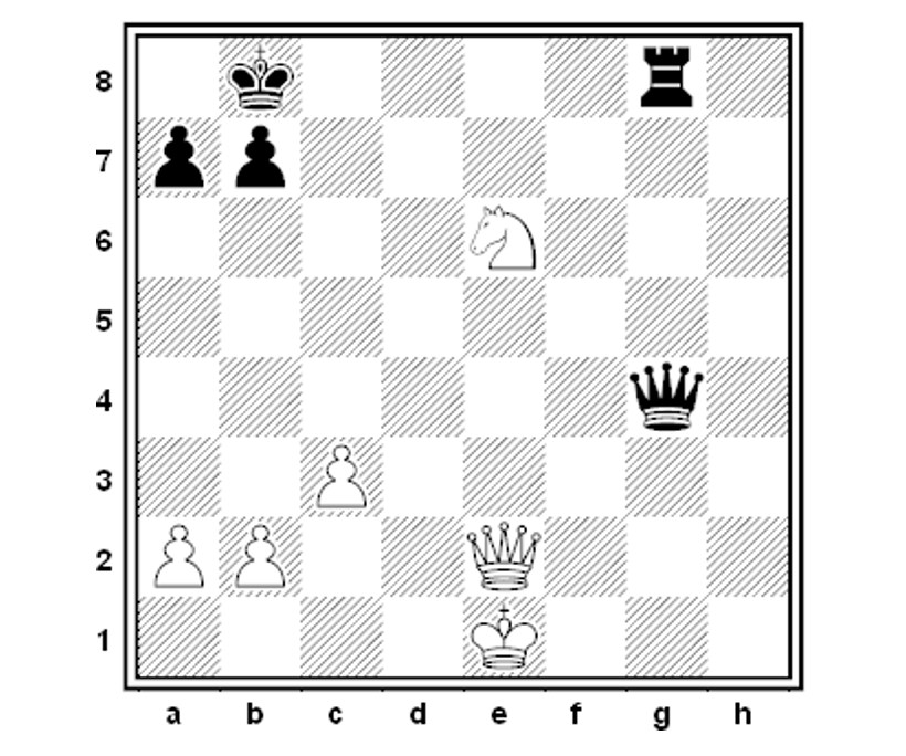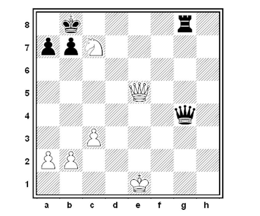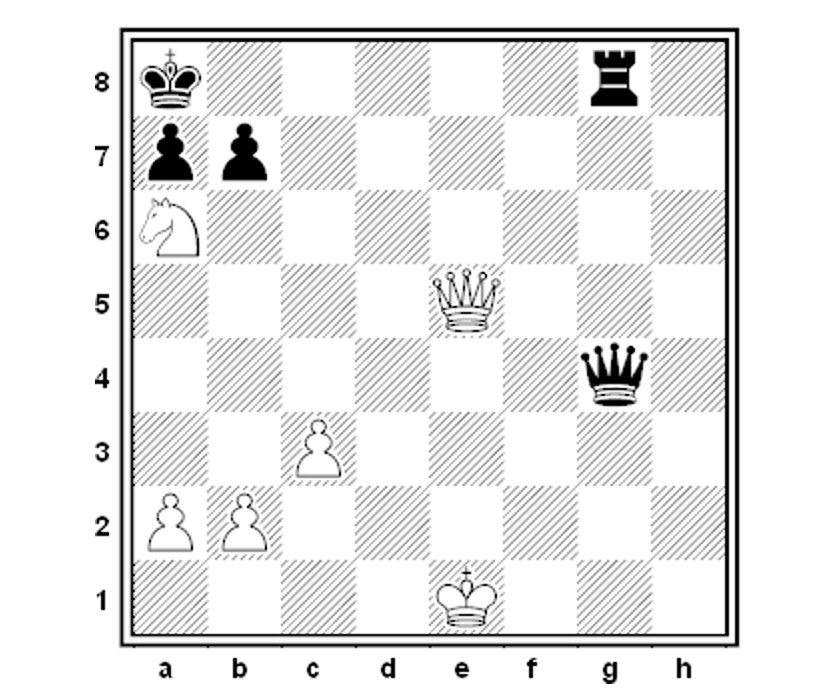 La situazione sembrerebbe favorevole al Nero ma il Bianco ha in serbo una sorpresa: su 1.De5 che dà scacco, il Re Nero non potendo andare in c8 (in quanto prenderebbe lo scacco matto con Donna in c7) è costretto ad andare in a8 1…Ra8 ma dopo 2. Cc7+ è di nuovo costretto a ritornare in b8 2…Rb8