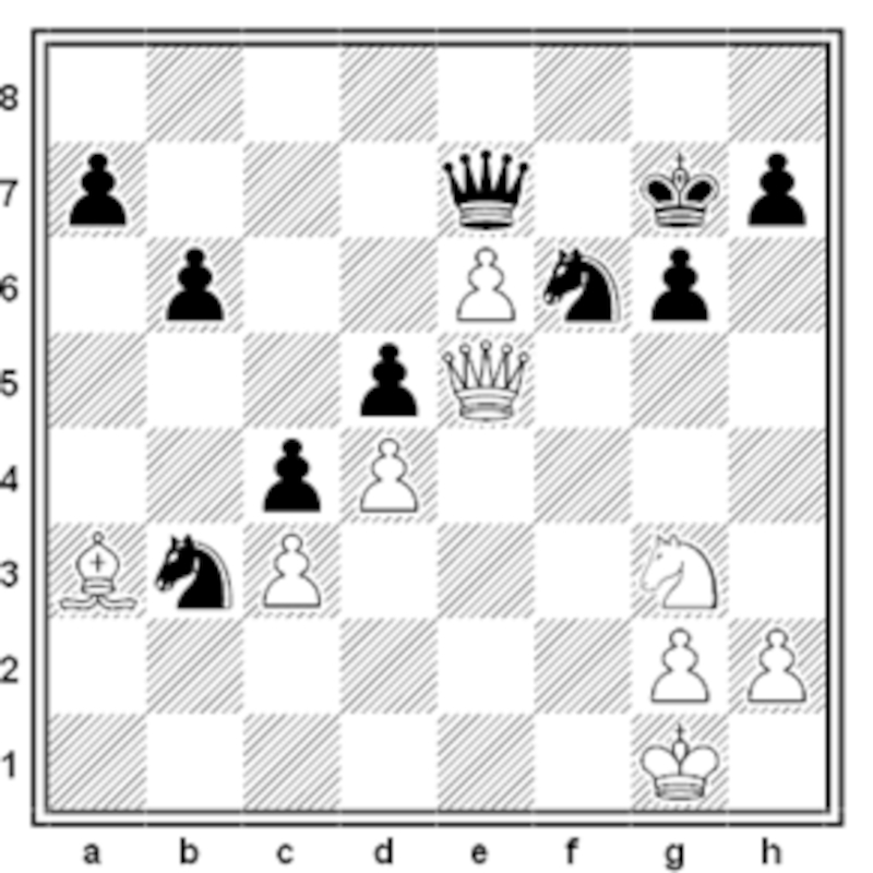 30…Dxa3 31.Ch5+ altro bel sacrificio che scardina la difesa del Re nero 31…gxh5 32.Dg5+ Rf8 33.Dxf6+ Rg8 34.e7 Dc1+ il pedone in promozione non può essere fermato se non con il sacrificio della Regina e quindi Capablanca cerca lo scacco perpetuo 37.Rh4 De4+ 38.Rxh5 De2+ 39.Rh4 De4+ 40.g4 De1+ 41. Rh5 e il nero abbandona.