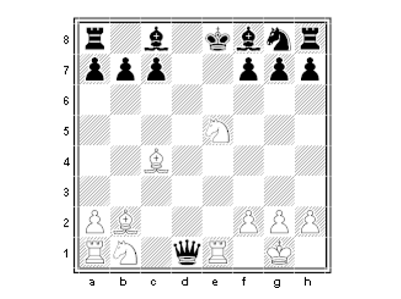 1. e4 e5 2. Cf3 Cc6 3. d4 exd4 4. Ac4 Ab4+ 5. c3 dxc3 6. O-O cxb2 7. Axb2 Af8 8. e5 d6 9. Te1 dxe5 10. Cxe5 Dxd1 … ammirate la spettacolare sequenza del prodigio