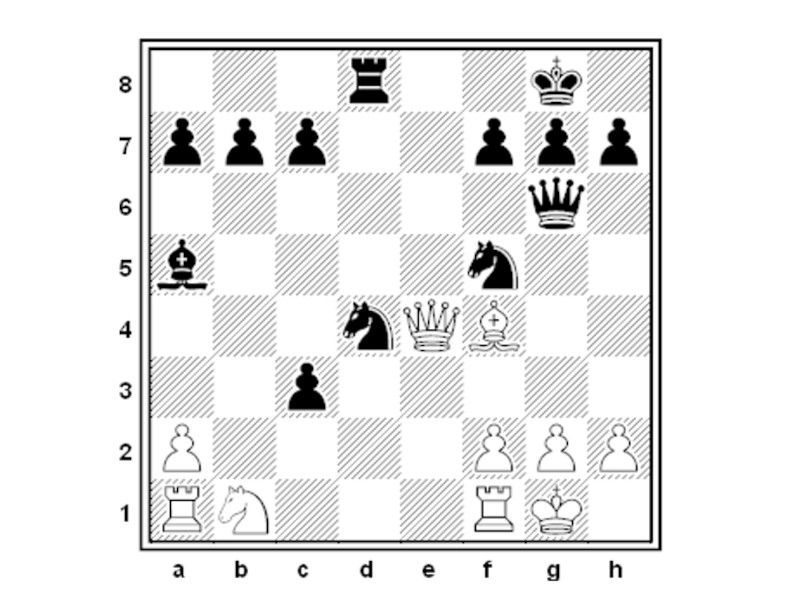 1. e4 e5 2. Cf3 Cc6 3. Cc3 Cf6 4. Ab5 La variante Spagnola della 4 Cavalli 4…Ac5 5. O-O O-O 6. Cxe5 Una piccola trappola per prendere l’iniziativa 6…Te8 7. Cxc6 dxc 8. Ac4 b5 9. Ae2 Cxe4 10. Cxe4 Txe4 11. Af3 Te6 12. c3? Una imprecisione che volge a favore del Nero 12… Dd3! 13. b4 Ab6 14. a4 bxa4 15. Dxa4 Ad7 16. Ta2 Tae8 17. Da6 Il materiale è pari ma la posizione no!