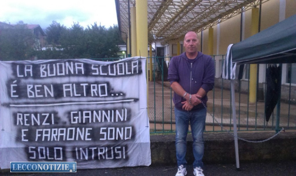 Lunedì mattina ,  alle 8.30, dopo aver accompagnato la piccola, di quasi 10 anni, al primo giorno di scuola e aver atteso che tutti i bambini fossero già seduti fra i banchi, ha appeso striscioni e si è incatenato alla ringhiera dell’istituto “Mondo Giusto” del Pascolo, a pochi passi dal cancello, ma abbastanza distante per non disturbare le lezioni.