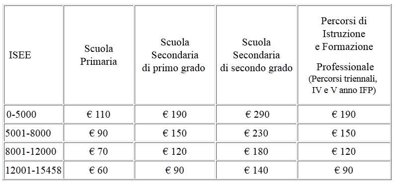 Agli aventi diritto verrà riconosciuta una dote, per ciascun figlio beneficiario, secondo la seguente tabella in relazione alle fasce di reddito di appartenenza e all’ordine e grado di scuola frequentata: