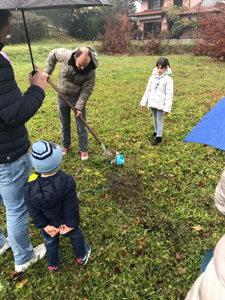 Successivamente ogni bambino ha scelto il suo albero applicando un fiocco col proprio nome e tutti insieme, con i genitori e rappresentanti del Comune, sono andati a piantarli nel giardino delle scuole elementari.