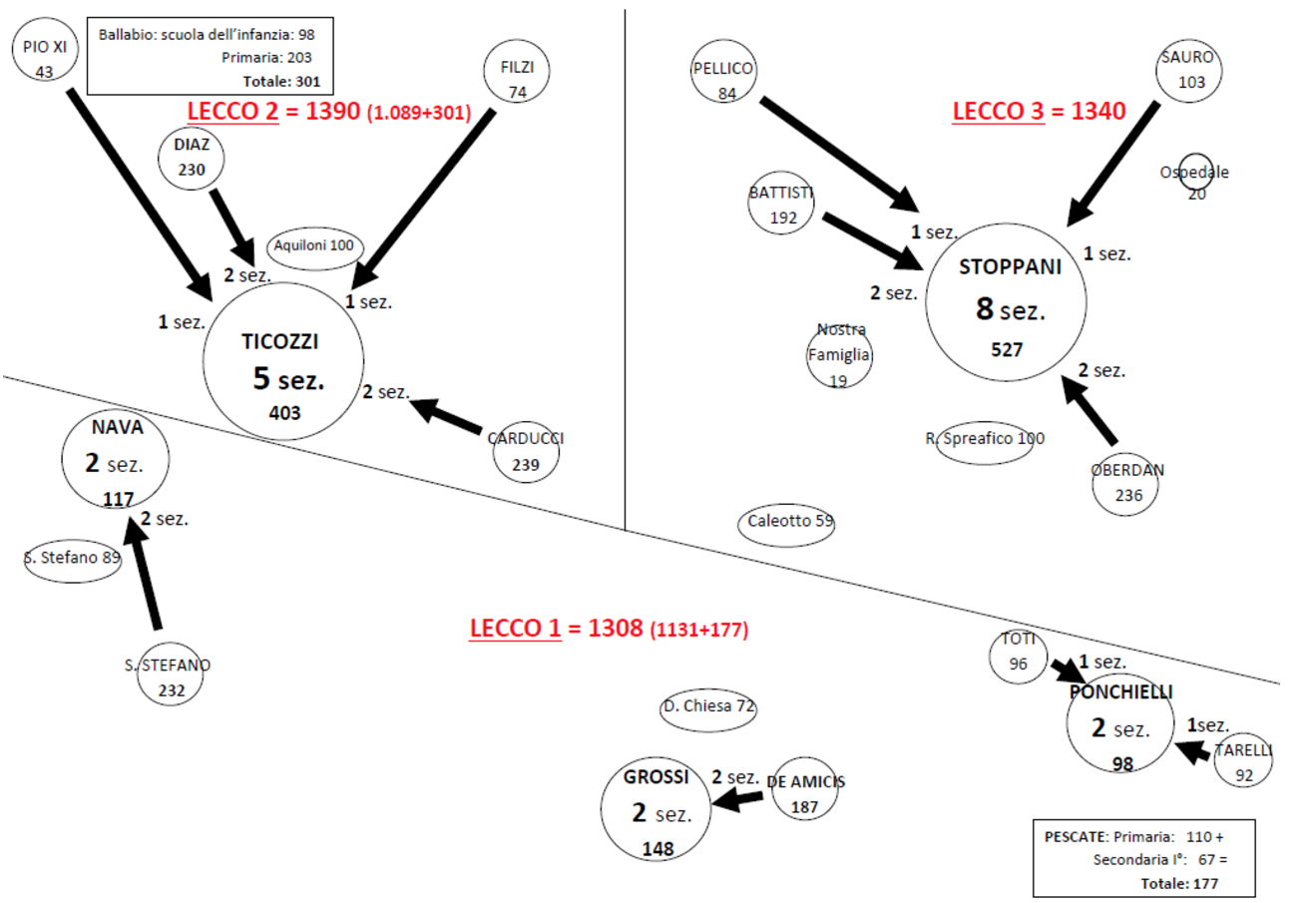 La decisione è stata quella di fondere gli attuali istituti comprensivi Lecco 1 e Lecco 4, tra le novità c’è lo spostamento della scuola primaria Silvio Pellico di Malnago da Lecco 2 a Lecco3, e della scuola primaria de La Nostra Famiglia dall’istituto comprensivo Lecco 2 all’istituto comprensivo Lecco 3. In “Lecco 2” restano anche le scuole dell’infanzia e primaria di Ballabio, quelle di Pescate in “Lecco 1”.