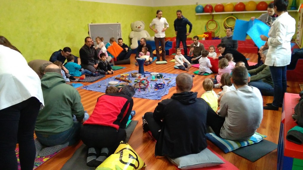 I papà e i bambini armati di tapettini, cuscino e calze antiscivolo si sono fatti guidare dai conduttori Manuel Mauri e Luca Ferranti insegnanti di yoga e meditazione, esperti di canto armonico e chitarra classica.