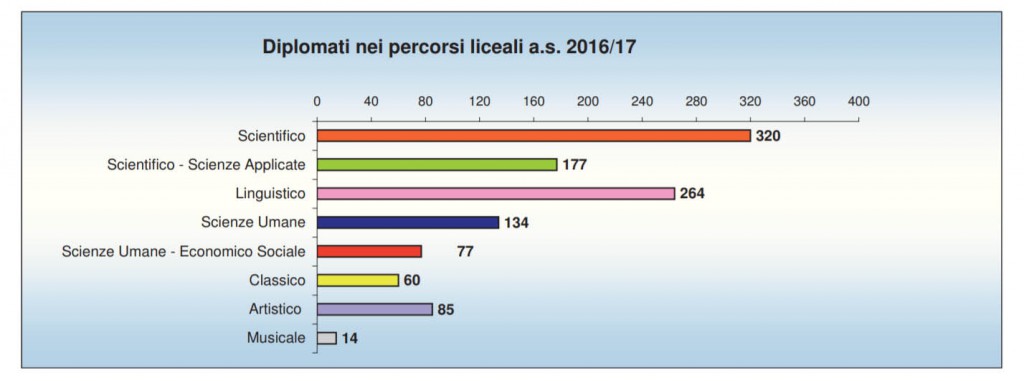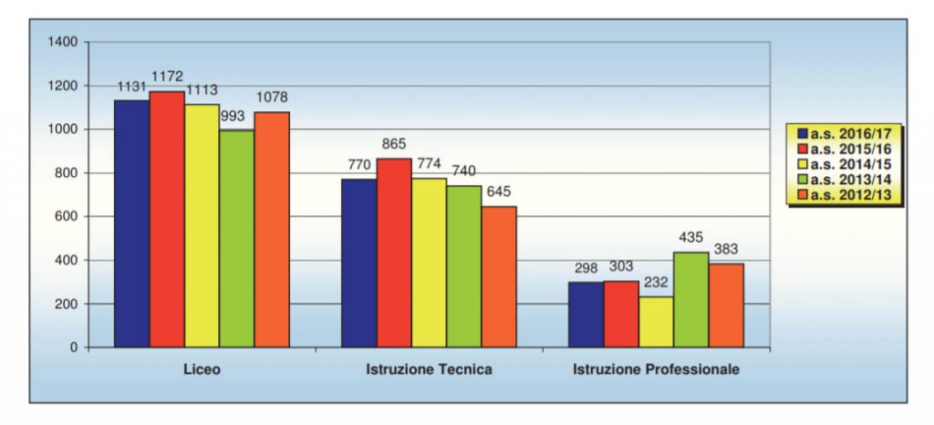 Complessivamente gli studenti che hanno conseguito il diploma di maturità nell’anno scolastico 2016/17 sono stati 2199, di questi 1958 gli studenti che si sono diplomati in un istituto superiore statale, pari al 89% del totale.
