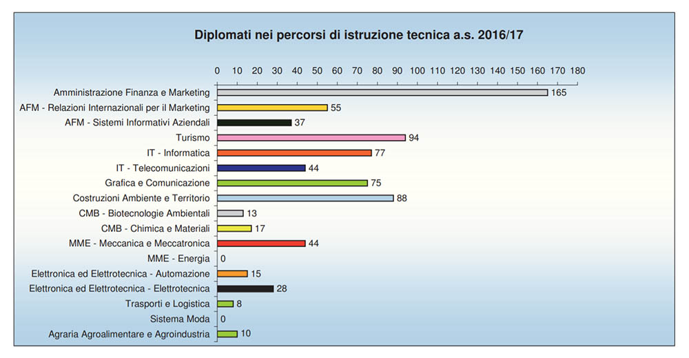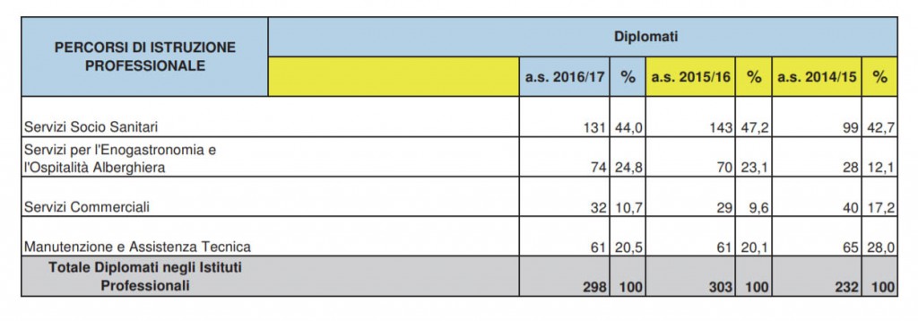 Negli istituti tecnici il 29,8% dei diplomati ha frequentato l’indirizzo amministrazione finanza e marketing, il 10,9% l’indirizzo turismo, e il 10,2% costruzioni ambiente e territorio. Negli Istituti Professionali, invece, la maggior parte dei diplomati ha frequentato l’indirizzo servizi socio sanitari (44%).