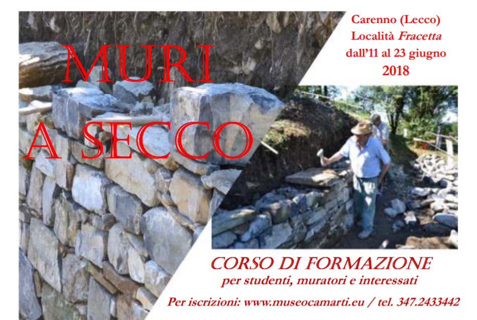 È previsto, inoltre, un intervento su un tratto di pavimentazione in pietra. Il Corso, nelle sole mattine di sabato 16 e sabato 23 giugno (ore 9/12), vede la partecipazione di muratori e altri operatori, non solo del luogo, interessati ad un primo approccio a queste tecniche. La predisposizione del Cantiere e l’organizzazione giornaliera, curata dall’Associazione, si è resa possibile grazie alla disponibilità, oltre che di Comune e privati, della adiacente Casa del Fanciullo ed alla collaborazione di Protezione Civile di Carenno e di alcune Imprese locali, mentre aziende private del settore hanno fornito materiali o dispositivi.