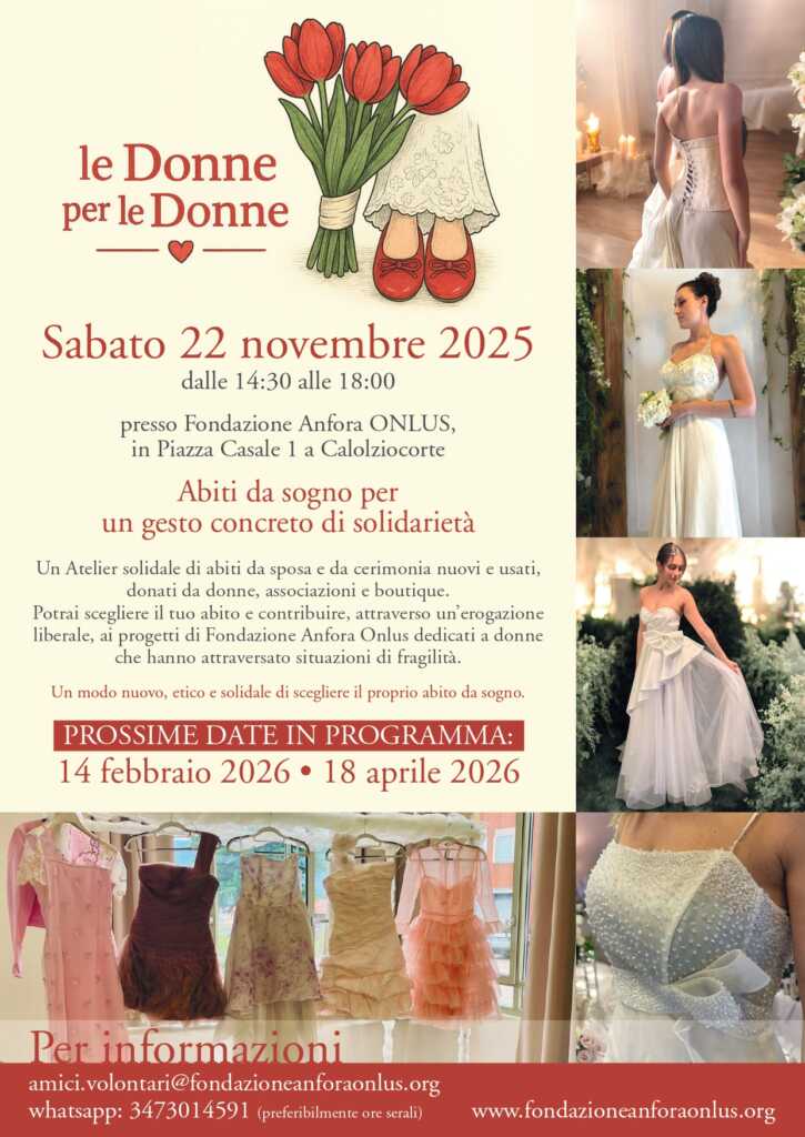 CALOLZIOCORTE – Gli abiti da sposa che diventano strumenti di solidarietà. Dopo il successo del primo appuntamento, torna l’iniziativa solidale “Le donne per le donne – Abiti da sogno per un gesto concreto”, promossa da Fondazione Anfora Onlus. L’evento si terrà sabato 22 novembre, dalle 14.30 alle 18, presso la sede della Fondazione in Piazza Casale 1 a Calolziocorte.