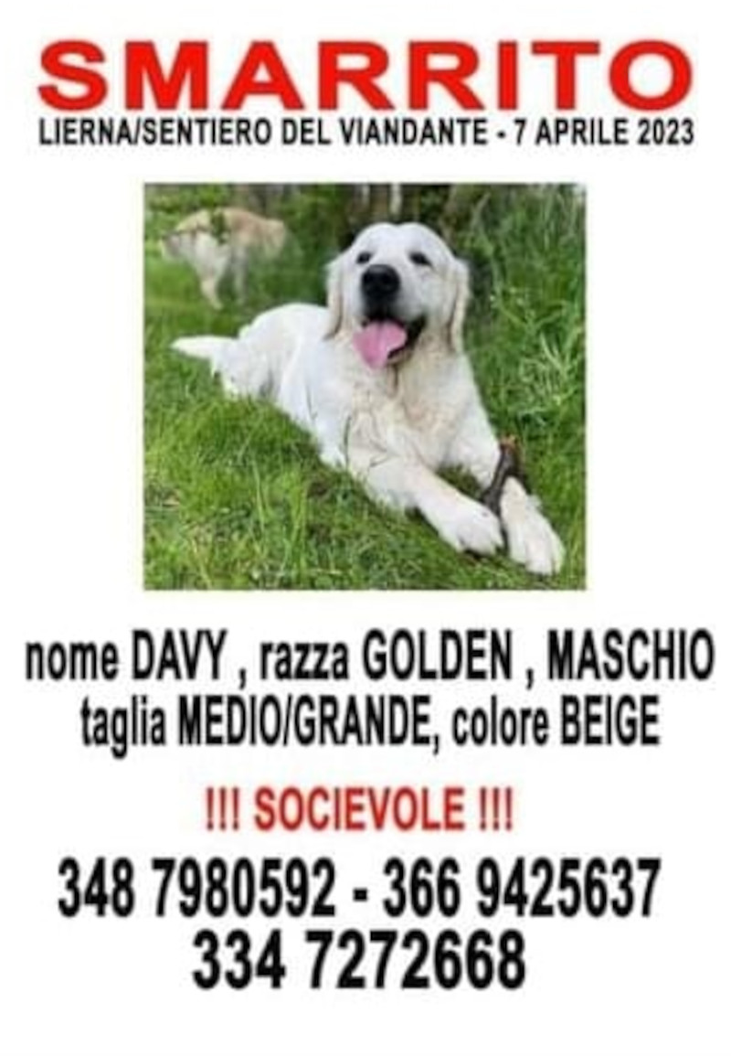 MANDELLO – Riceviamo e pubblichiamo l’appello dei proprietari di Davy, Golden Retriver di colore chiaro che si è perso il 7 aprile sopra Lierna.