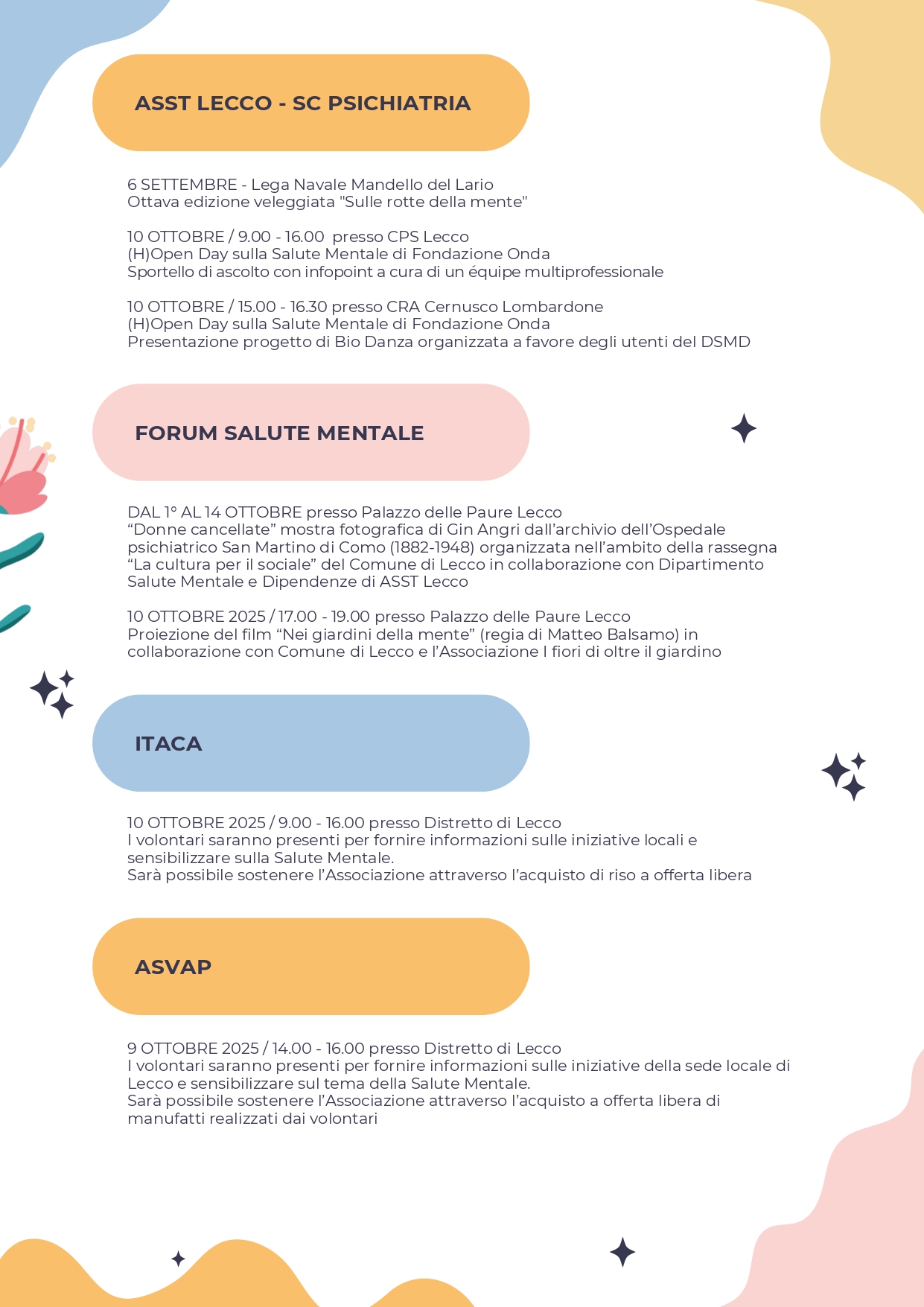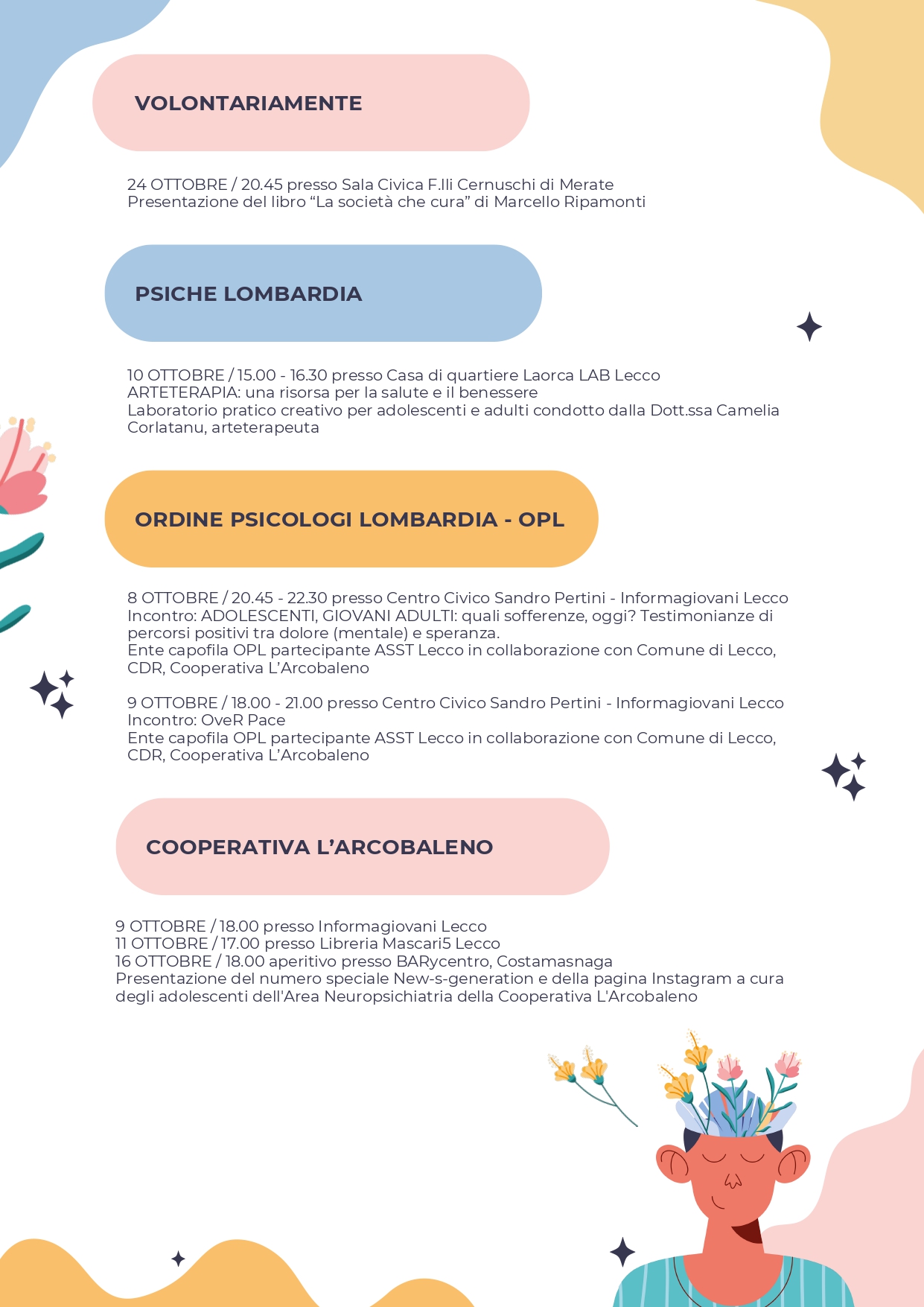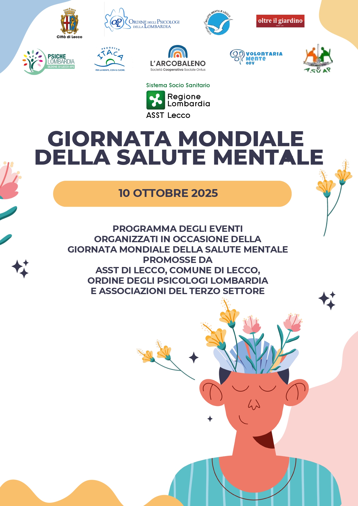 In occasione della Giornata mondiale della Salute Mentale, ASST Lecco, insieme al Comune di Lecco, all’Ordine degli Psicologi Lombardia e alle Associazioni del Terzo Settore, organizza inoltre una serie di iniziative dedicate, di cui si allega il programma.