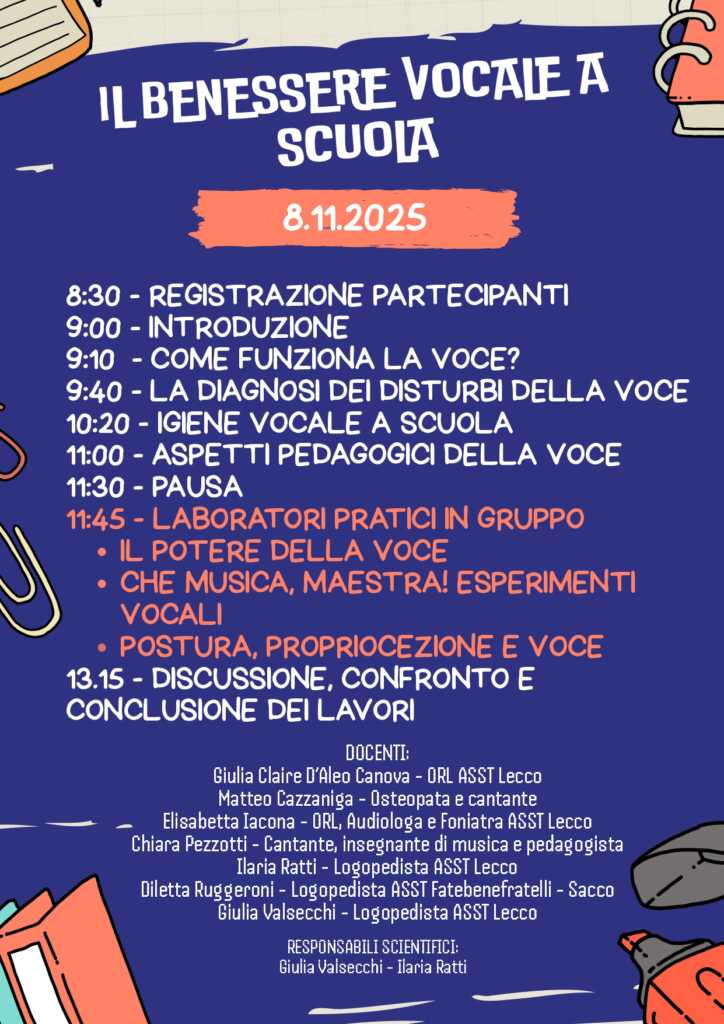 Il laboratorio si terrà sabato 8 novembre, dalle 8.30 alle 13.30, presso l’Aula Bianca della Palazzina Amministrativa dell’Ospedale A.Manzoni di Lecco, previa iscrizione al portale Eventbrite. Il corso combina sessioni teoriche con specialisti dell’ASST di Lecco e laboratori pratici condotti da professionisti del settore: Diletta Ruggeroni, logopedista dell’ASST Fatebenefratelli-Sacco, Chiara Pezzotti, insegnante di musica e cantante, e Matteo Cazzaniga, osteopata e cantante.