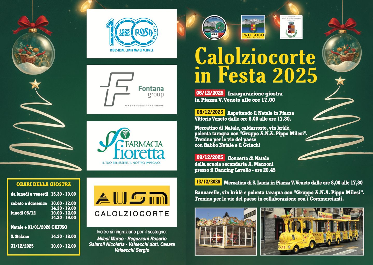 Novità di quest’anno il “Mercatino di Santa Lucia” il 13 dicembre a testimonianza delle radici bergamasca di Calolziocorte dove è sempre stata tradizione festeggiare Santa Lucia. Anche in questo caso scenderanno in campo gli Alpini di Calolzio con le loro prelibatezze e ci sarà il trenino per le vie del paese in collaborazione con i commercianti.