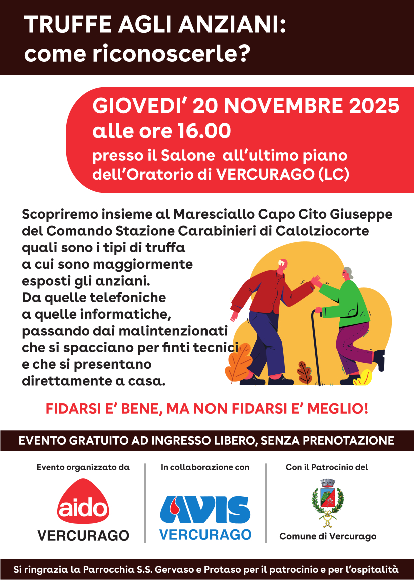 VERCURAGO – Una nuova iniziativa promossa da Aido e Avis Vercurago con il patrocinio del Comune e della Parrocchia di Vercurago. Giovedì 20 novembre alle ore 16 presso il salone all’ultimo piano dell’oratorio San Giovanni Bosco di Vercurago si terrà l’incontro dal titolo “Truffe agli anziani: come riconoscerle?”