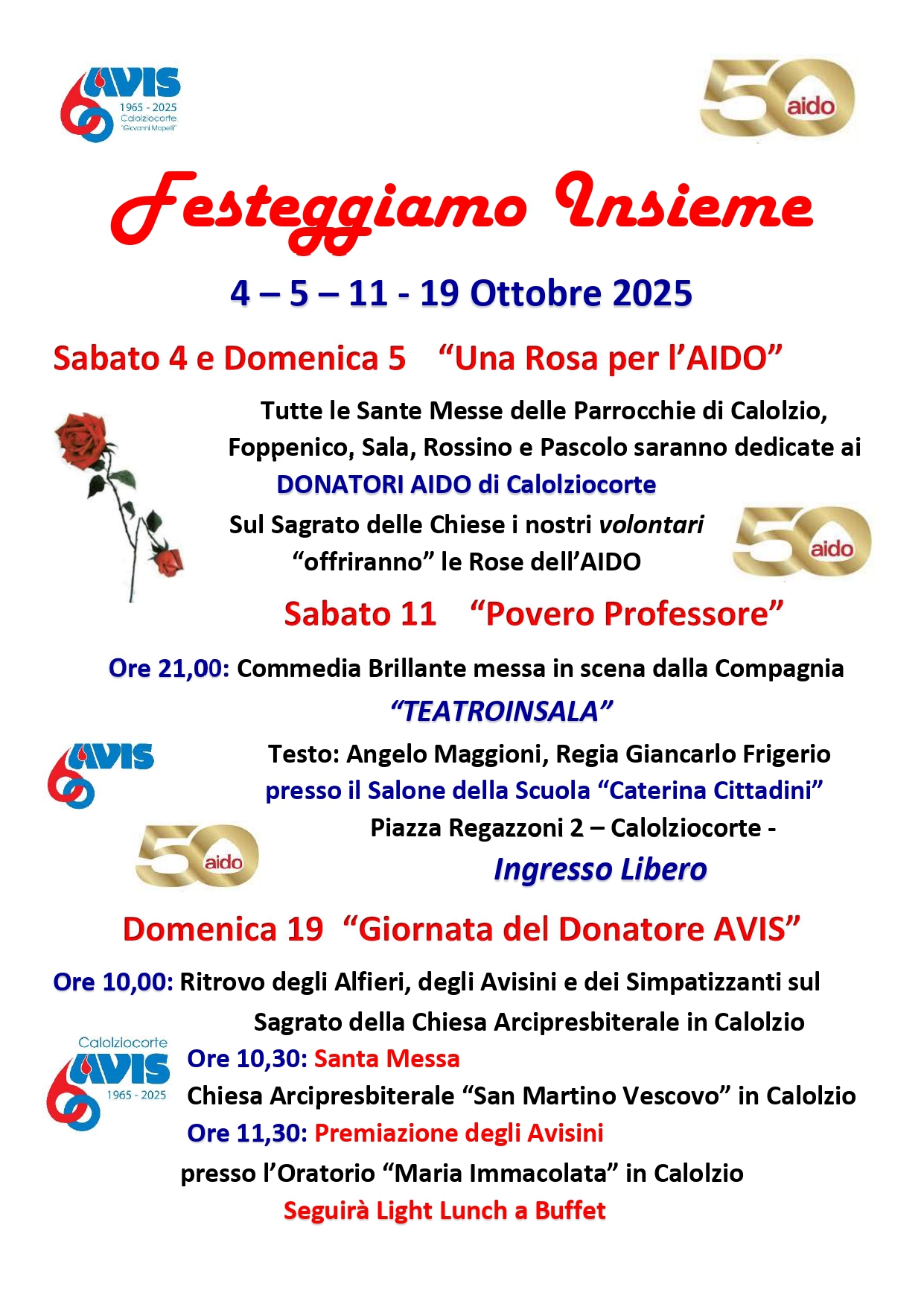 L’appuntamento teatrale messo in cantiere dalla Comunale Avis e dal Gruppo Aido di Calolziocorte, ormai giunto alla sua sesta edizione, è stato denominato Festeggiamo Insieme, per riprendere quanto era stato organizzato nell’aprile 2015 dalle due associazioni di volontariato, in occasione degli anniversari: 50° dell’Avis e 40° dell’Aido, festeggiati all’epoca con una serata con canti gospel e l’inaugurazione del parco Don Gnocchi.