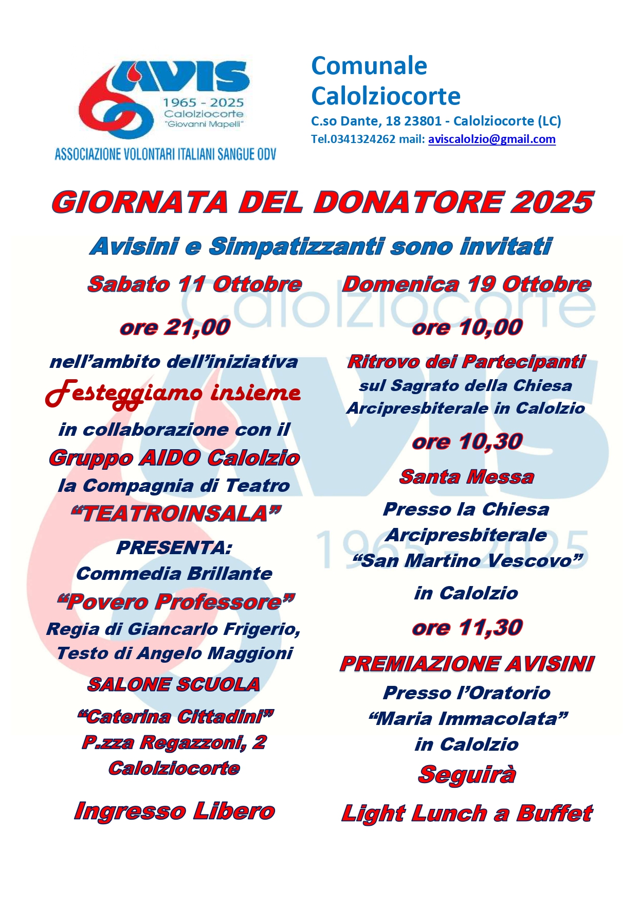Sabato 11 ottobre alle ore 21, i festeggiamenti delle due associazioni, proseguiranno con un Invito a teatro. Presso il Salone della Scuola “Caterina Cittadini” di Calolziocorte, in piazza Regazzoni, verrà messa in scena dalla Compagnia “Teatroinsala” la commedia brillante: “Povero professore” (ingresso gratuito).