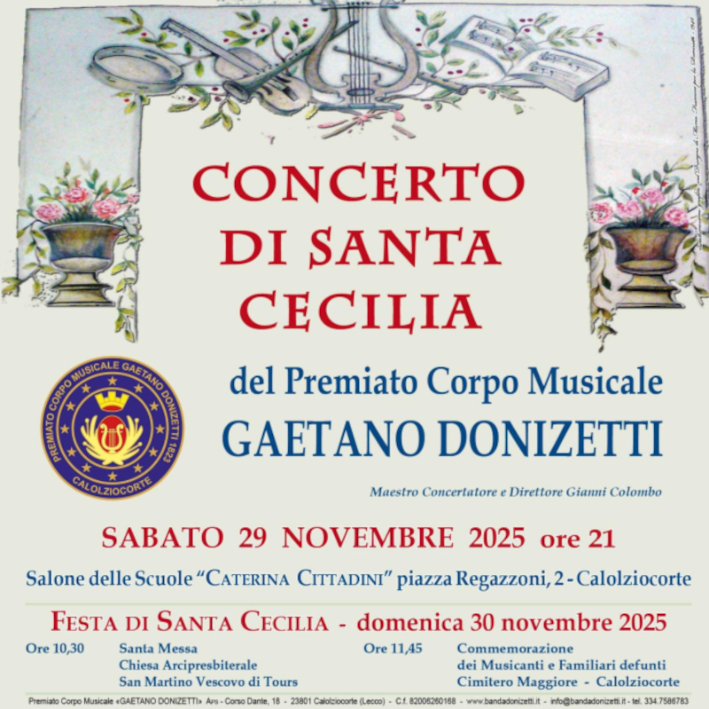 CALOLZIOCORTE – Il Premiato Corpo Musicale “Gaetano Donizetti” comunica che sabato 29 e domenica 30 novembre offre alla comunità il tradizionale concerto in onore della Patrona Santa Cecilia, celebrando la festa annuale della Banda nella giornata di domenica, col ringraziamento alla S. Messa delle 10.30 in chiesa arcipresbiterale e la commemorazione al cimitero maggiore, verso la conclusione di un anno di attività che ha registrato ancora importanti eventi tra i quali in particolare spicca, a livello straordinario, la partecipazione a Roma al Giubileo delle bande e della musica popolare, oltre ai concerti che allietano ormai con appuntamento fisso annuale nel territorio.