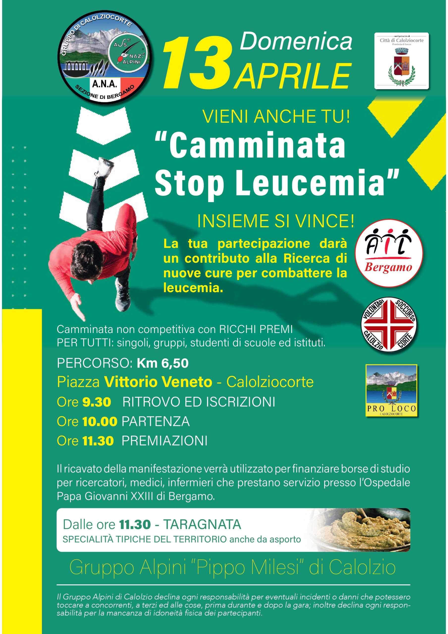 CALOLZIOCORTE – Domenica 13 aprile torna la “Camminata Stop Leucemia”, il tradizionale appuntamento benefico organizzato dal Gruppo Alpini “Pippo Milesi” di Calolziocorte in favore della ricerca di nuove cure per combattere la leucemia. Il ricavato della manifestazione, infatti, verrà utilizzato per finanziare borse di studio per ricercatori, medici, infermieri che prestano servizio presso l’ospedale Papa Giovanni XXIII di Bergamo.