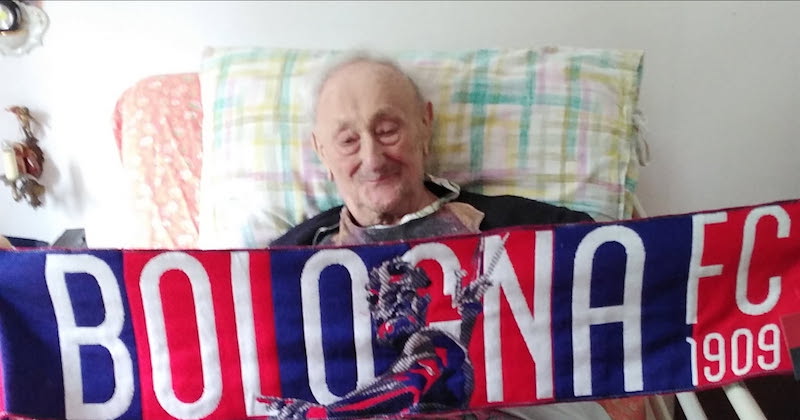 Tifoso appassionato del Bologna, Luigi custodisce con cura la sciarpa che la nipote Mavi gli ha regalato per la vittoria della Coppa Italia, segno di una fede calcistica mai spenta.