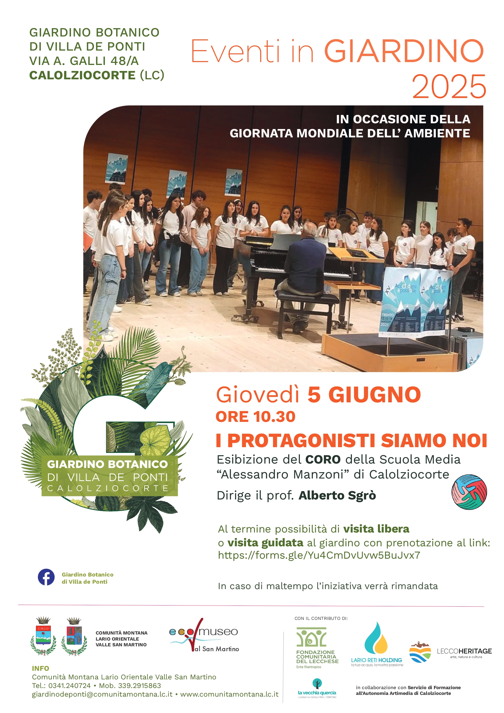 Giovedì 5 Giugno si terrà presso il Giardino Botanico di Villa de Ponti a Calolziocorte un’esibizione del Coro della Scuola Media A. Manzoni di Calolzio, a cui segurià una visita guidata di quell’oasi verde nel cuore della Valle San Martino. L’iniziativa è la perfetta occasione per sensibilizzare i partecipanti sulla salvaguardia del pianeta e sulla necessità di promuovere stili di vita sostenibili, a partire dalle comunità locali. Gli orti botanici sono infatti importanti centri di conservazione della biodiversità e svolgono un ruolo cruciale nella sensibilizzazione riguardo alla sostenibilità ambientale.
