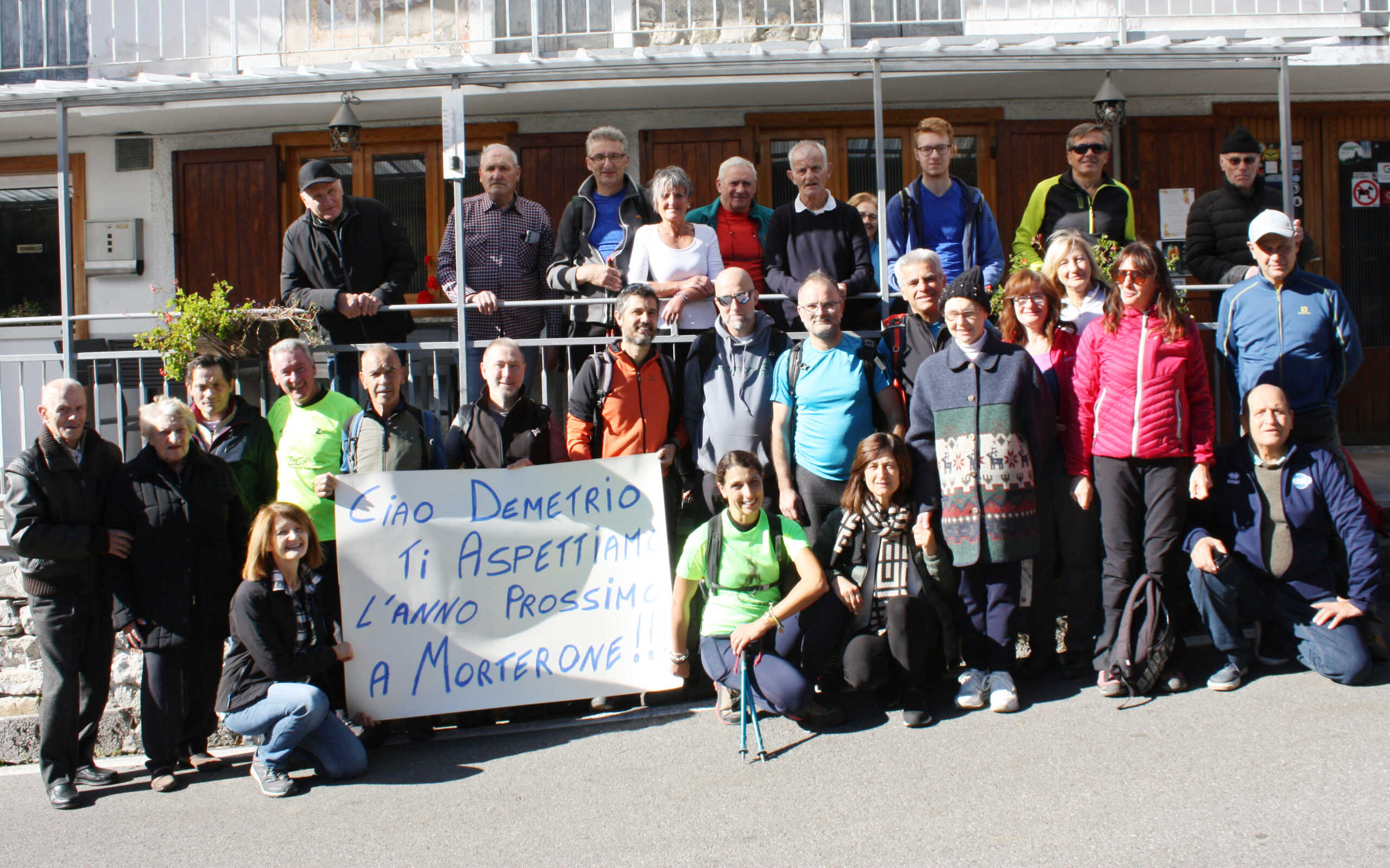 Prima di entrare nella trattoria, è stata scattata la foto di gruppo: Mauro Tagliaferri ha esposto un cartellone con la scritta “Ciao Demetrio, ti aspettiamo l’anno prossimo a Morterone”. Demetrio, che da oltre dieci anni fa parte del gruppo dei camminatori Telethon, è solito percorrere a piedi la tratta Monte Marenzo–Morterone–Monte Marenzo. Lo scorso 28 settembre, è caduto per circa 15 metri dal campanile di Val Montanaia (provincia di Pordenone). Trasportato in elicottero all’ospedale di Udine, ora è a casa: ha riportato alcune fratture, ma sta bene.