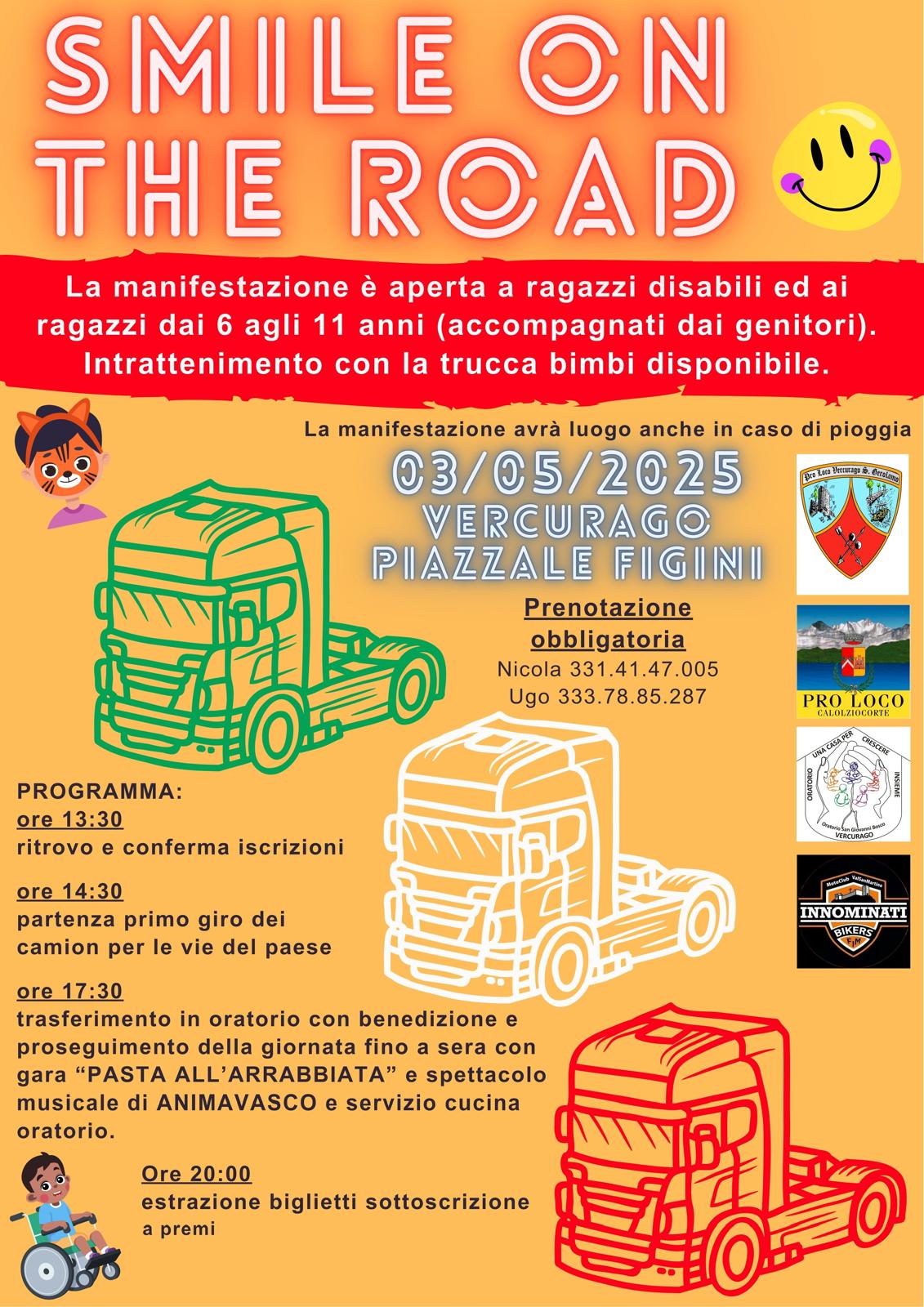 VERCURAGO – Il prossimo 3 maggio tornano a rombare sulle strade di Vercurago i camion di “Smile on the road”. La manifestazione è aperta ai ragazzi disabili e ai ragazzi dai 6 agli 11 anni (accompagnati dai genitori). Sarà disponibile anche l’intrattenimento col truccabimbi.