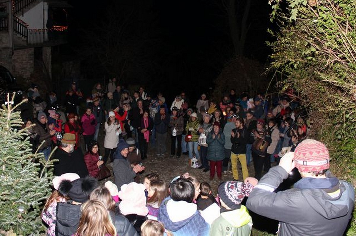 Dal cortile della scuola ha poi preso avvio la camminata con lanterne verso il borgo di Nesolio, accompagnata dal canto e dalla presenza di uno zampognaro. Il percorso, illuminato dalle luci, si è trasformato in un cammino simbolico capace di unire generazioni diverse. Giunti a Nesolio, i partecipanti hanno potuto ammirare i quadri viventi, installazioni realizzate da figuranti che hanno rappresentato scene di vita quotidiana del borgo di inizio ‘900 restituendo memoria e valore alla storia del luogo. Nella piccola piazzetta, i bambini hanno poi posizionato le lanterne da loro realizzate ai piedi dell’albero, suggellando il senso dell’iniziativa.