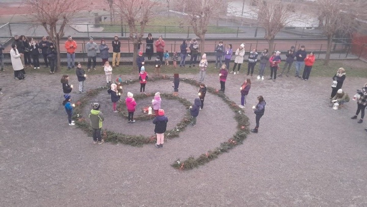 L’iniziativa ha preso avvio presso il cortile della scuola primaria di Erve a indirizzo Montessori, dove i bambini hanno introdotto il cammino con la Spirale della Luce, un rito Montessori preparato nei giorni precedenti. Un momento molto partecipato e simbolico, vissuto nel silenzio e nella calma, che ha invitato grandi e piccoli a rallentare e a mettersi in ascolto. La spirale ha rappresentato un gesto di pace e di cura, in cui ogni luce accesa è diventata segno di attenzione verso sé stessi e verso la comunità.