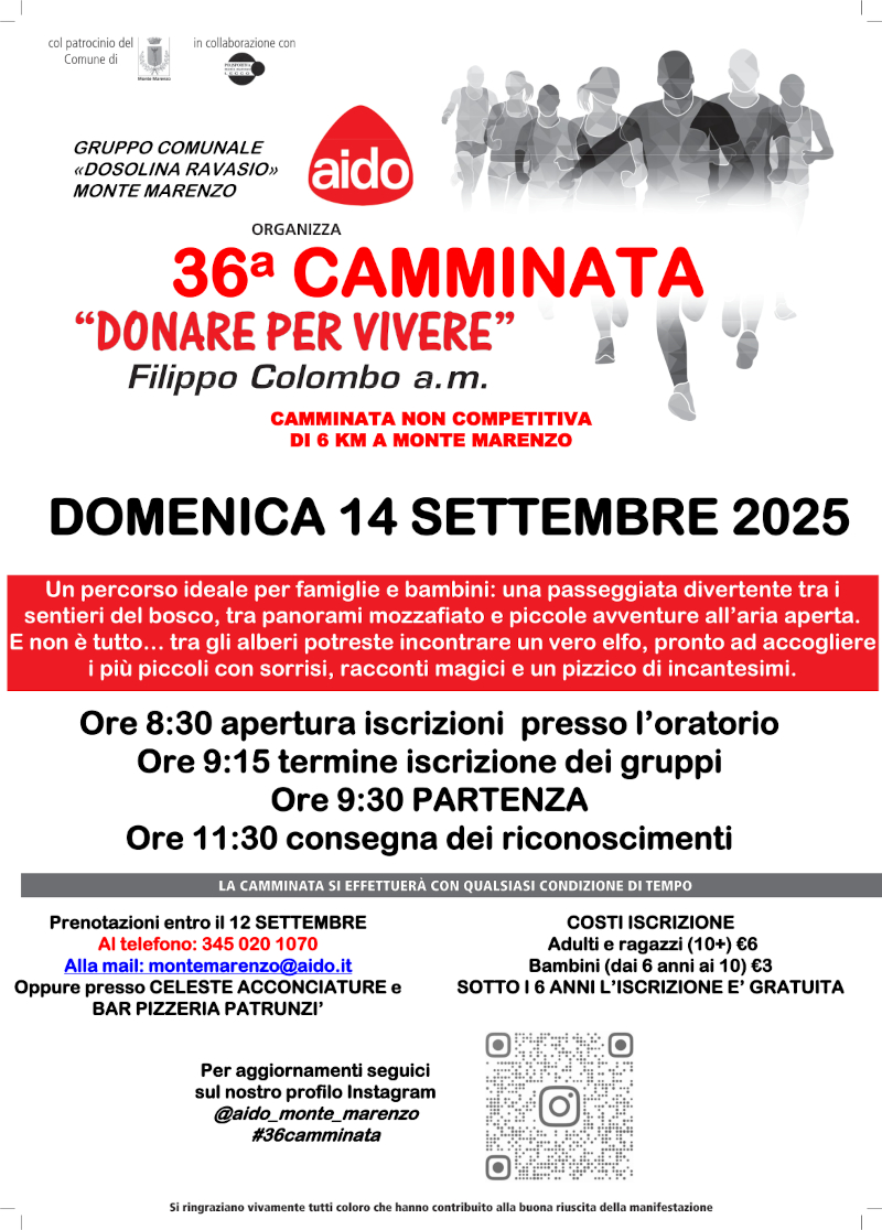 MONTE MARENZO – Tutto pronto per la 36^ Camminata Aido “Donare per Vivere”, alla memoria di Filippo Colombo, si terrà a Monte Marenzo domenica 14 settembre con partenza prevista per le ore 9.30 presso l’oratorio. La camminata è organizzata dal Gruppo Comunale Aido di Monte Marenzo “Dosolina Ravasio” in collaborazione con la Polisportiva Monte Marenzo.