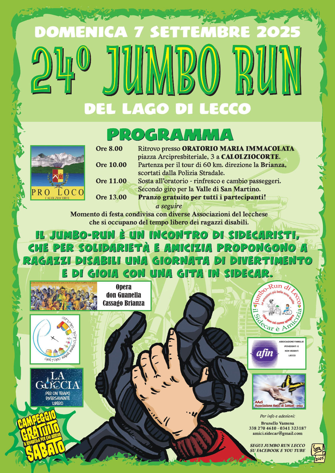 CALOLZIOCORTE – Un lungo corteo di sidecar, con mezzi provenienti da tutta Italia e da oltralpe, sono attesi domenica 7 settembre a Calolzio. In programma la 24^ edizione della Jumbo Run del Lago di Lecco, iniziativa benefica che regalerà a ragazzi disabili una giornata emozionante sulle strade lecchesi.