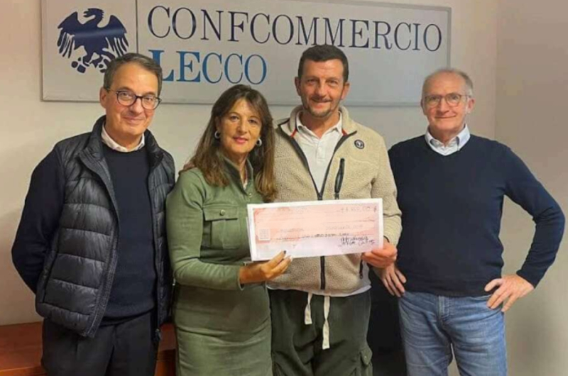 L’assegno di 3000 euro, relativo a quanto raccolto in occasione dello spettacolo di ottobre, è stato consegnato dalla presidente di Confcommercio Lecco-Zona Valle San Martino, Cristina Valsecchi, nelle mani di Giancarlo Ferrario, presidente dell’Associazione Fabio Sassi Odv; presenti anche il volontario Maurizio Todeschini e Luca Ronchetti.