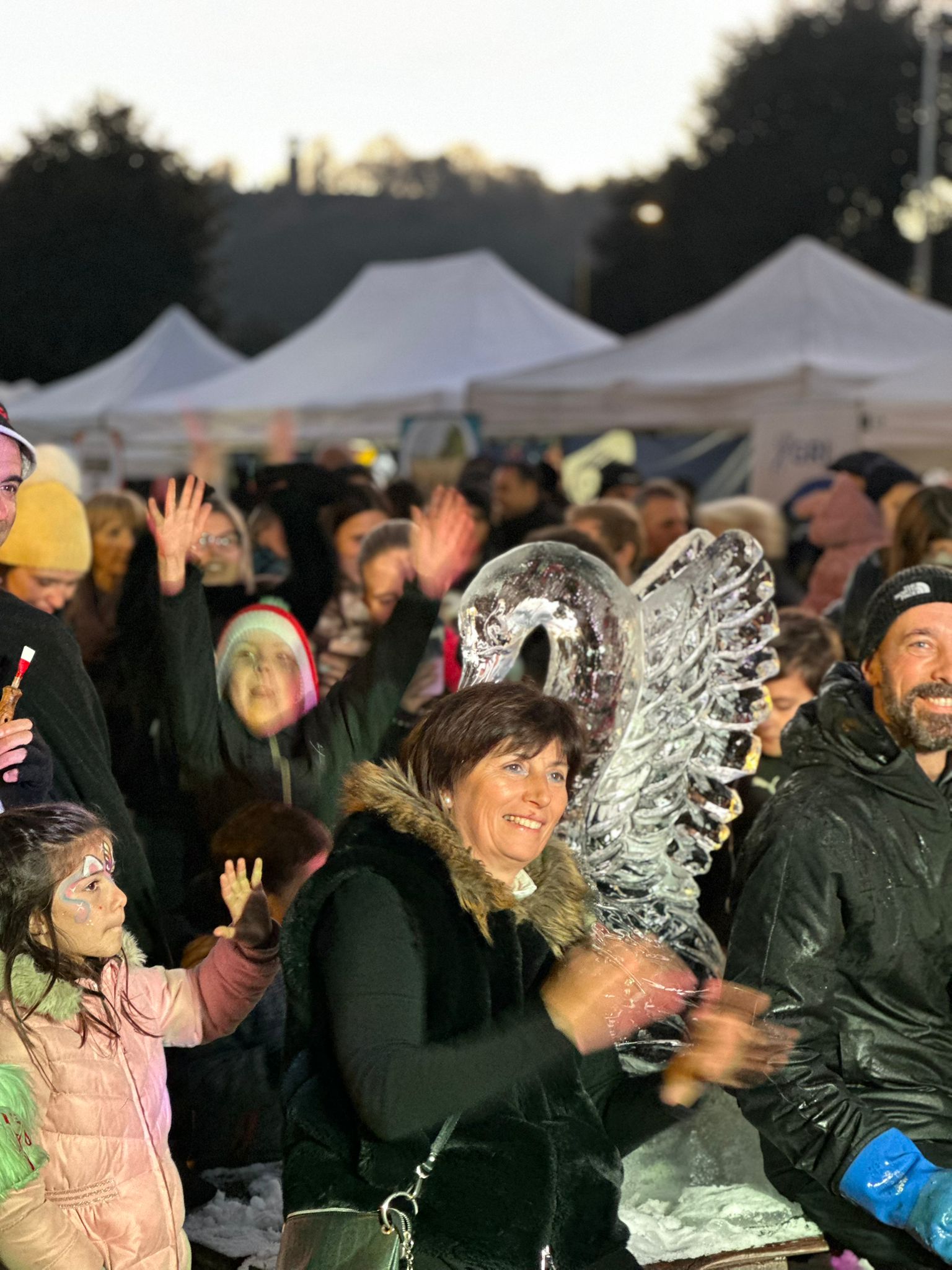 A seguire, una performance live a cura del campione del mondo Francesco Falasoni che, partendo da un blocco di ghiaccio, ha realizzato, dinnanzi allo stupore ed ammirazione di grandi e bambini, una stupenda scultura, un maestoso cigno, ancora più suggestivo se ammirato con il riflesso delle luci dell’albero e degli addobbi luminosi.