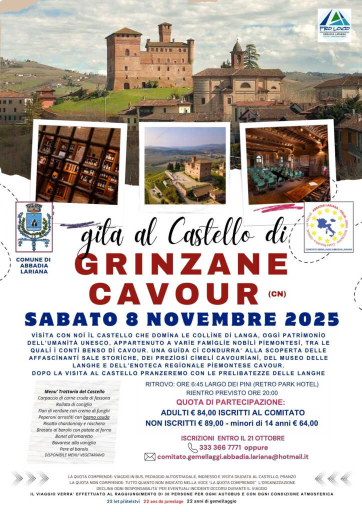 ABBADIA LARIANA – Un viaggio storico ed enogastronimico nelle Langhe. È la proposta del Comitato Gemellaggi di Abbadia Lariana, che sabato 8 novembre porterà i partecipanti al Castello di Grinzane Cavour (CN), patrimonio Unesco e luogo simbolo della storia piemontese, legato indissolubilmente alla figura di Camillo Benso Conte di Cavour.