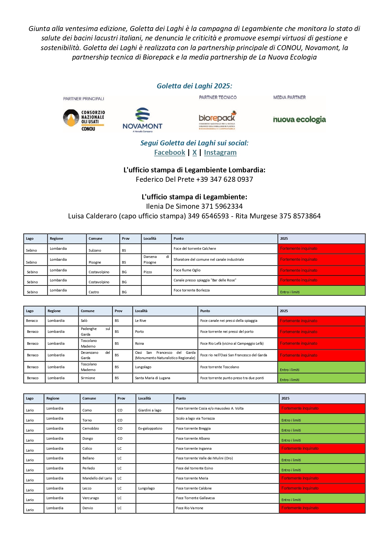 “Tra i bacini storicamente monitorati in questo ventennale della campagna – dichiara Emilio Bianco, portavoce della Goletta dei laghi 2025 – fin dall’inizio, un ruolo centrale lo hanno sempre avuto i 5 grandi laghi lombardi: Iseo, Garda, Maggiore, Ceresio e Lario. In tutti questi anni, grazie all’impegno costante di volontarie e volontari, abbiamo seguito l’evoluzione della qualità delle loro acque, riscontrando in alcuni punti criticità persistenti e concentrazioni elevate di inquinanti microbiologici, che indicano problemi strutturali piuttosto che episodi isolati. Un dato particolarmente preoccupante, al di là delle singole performance anche migliorative registrate dallo scorso anno, riguarda il netto peggioramento rispetto al 2023, quando molti dei campioni risultarono entro i limiti di legge, complice probabilmente la siccità che aveva ridotto notevolmente l’apporto di inquinanti dagli affluenti”.