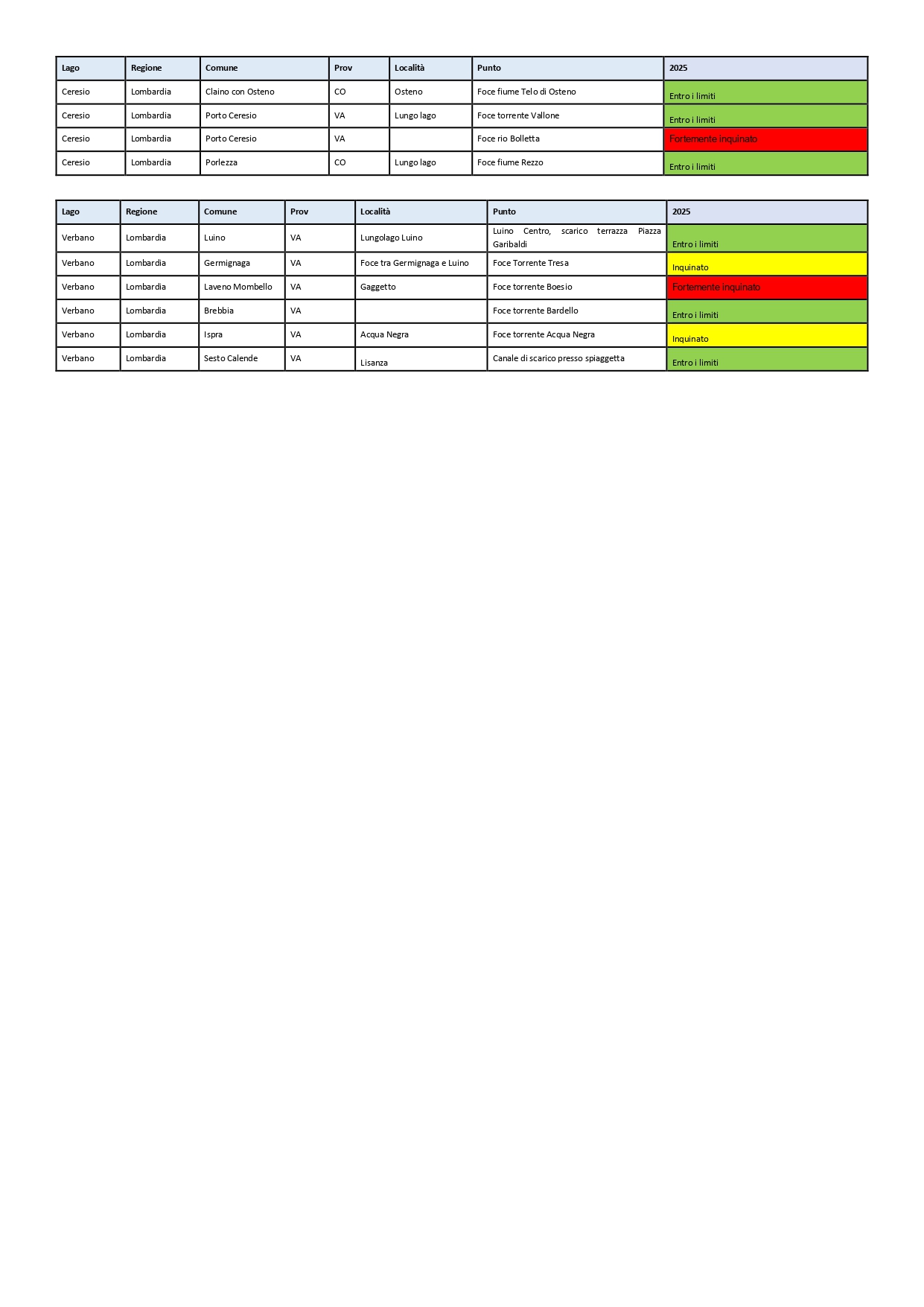 Cinque però sono i punti risultati fortemente inquinati: la foce del torrente Cosia, fuori dai limiti dal 2020; la foce del torrente Inganna, fortemente inquinato anche nel 2024 e inquinato nel 2022 mentre nel 2023 risultato nei limiti; la foce del torrente Meria, fortemente inquinato negli ultimi 3 anni; la foce del torrente Caldone, dal 2009 mostra risultati alterni con prevalenza di concentrazioni al di fuori dei limiti di legge; e la foce del rio Varrone, dal 2023 entro i limiti. Di seguito si lascia la tabella con tutte le località.