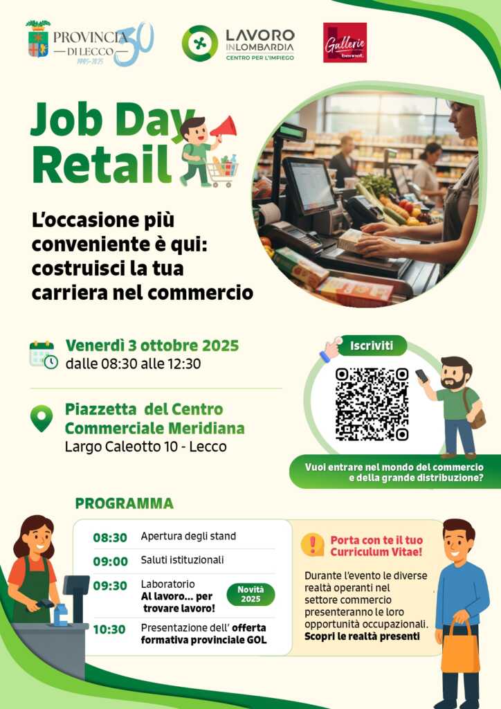 Il Job Day Retail si inserisce nel programma di eventi promossi dalla Provincia di Lecco per il raggiungimento degli obiettivi strategici assegnati da Regione Lombardia alle Province lombarde nell’ambito della Convenzione 2024-2026 per la gestione delle funzioni delegate.